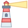 A coastal cityscape during sunset featuring a lighthouse with blue wave patterns, a harbor with boats, and a distant city skyline with a tall building, under a partly cloudy sky with the moon visible.